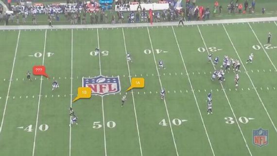Worth noting: The Rams run a lot of keepers, and this play starts off creating that illusion before Goff turns his attention to the other side of the field. In this play, he’s supposed to read Giants safety Landon Collins (identified in red). If he’s deep, the throw goes to Kupp underneath (outlined as “1A”). If he plays up, it goes deep to Watkins (“1B”).
