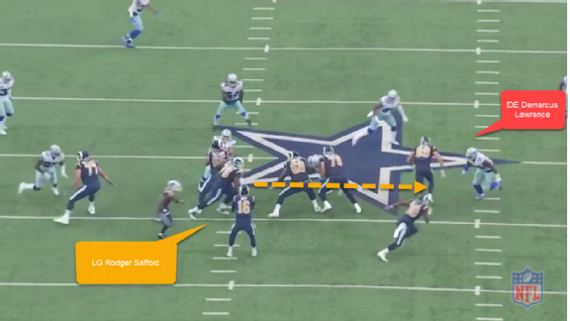 Worth noting: The Rams borrowed this play from the Chiefs, who borrowed it from the Patriots. Once again, Austin (shown in the first image about to come across the field) is able to draw coverage in his direction. This time it’s the Cowboys’ safety (shown in the first image creeping forward). That allows Gurley to dart past him and into the seam. But another key to this play is left guard Rodger Saffold (shown in the second image). The Rams pulled Saffold and had him pick up NFL sack leader DeMarcus Lawrence as he came around the edge. The timing of the block was perfect.