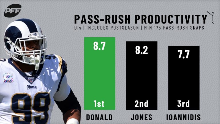 As we’ve come to expect over the years, Los Angeles Rams star interior defensive lineman Aaron Donald led all at his position in PFF pass-rush productivity in 2019 at 8.7. He recorded 80 total pressures, including 53 hurries, 13 hits and 14 sacks, across his 539 pass-rushing snaps this past season. The only other NFL interior defensive lineman with 300-plus pass-rushing snaps that recorded a PFF pass-rush productivity above 8.0 was Kansas City Chiefs’ Chris Jones at 8.2.