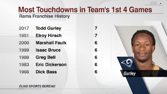 On Sunday, in the Los Angeles Rams’ eye-opening 35-30 road win over the Dallas Cowboys, Gurley gained 215 yards from scrimmage, the most by a Rams player since Steven Jackson in 2006. He gained 121 yards on 23 carries and had a career-high 94 receiving yards on a career-high seven catches. He scored his seventh touchdown, one more than he scored all of last year and, according to Elias Sports Bureau, tied with Elroy “Crazy Legs” Hirsch in 1951 for the most in Rams history through the first four games.