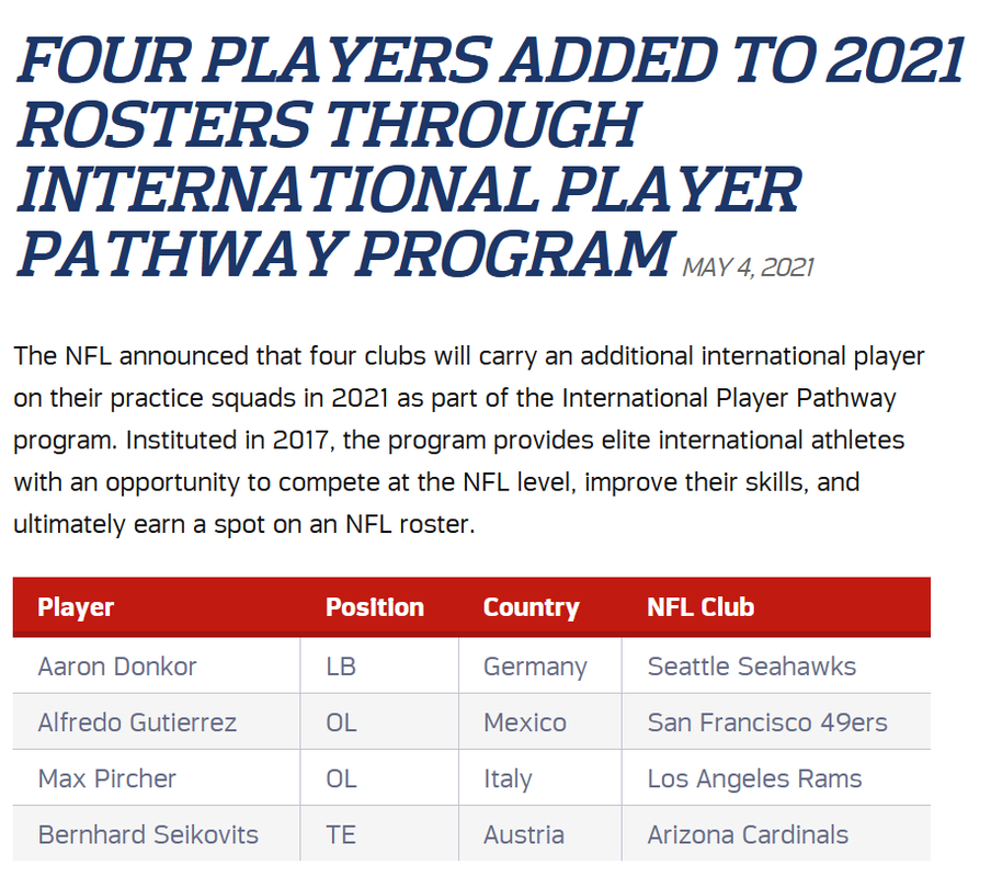 The four NFC West clubs will carry these players on their rosters until the end of training camp. At that time, each player will be eligible for an international player practice squad exemption with his assigned team. This provides the assigned team an additional practice squad member for the season.