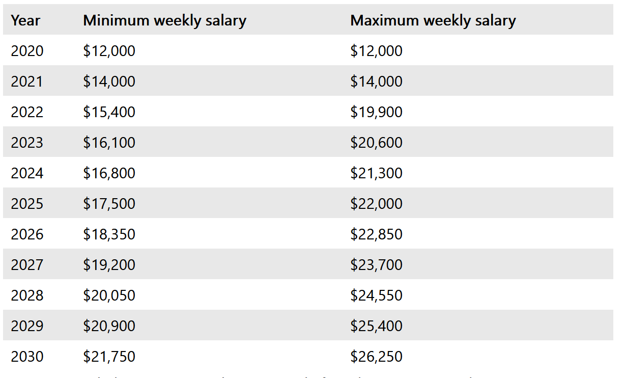These practice squad players receive a fixed weekly salary within the following minimum and maximum amounts over the duration of the current CBA.