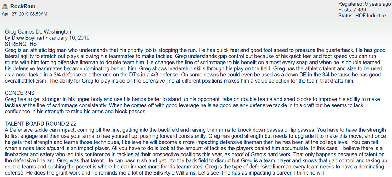 Gaines to me is the best pick in this draft. Been saying forever that being able to anchor in and not get washed out in the run game while playing one gap on the nose in this defense are not mutually exclusive. This guy looks like he’s got the toolset to do that for us. Rams did a good job dealing with neither of the early options being available at 31 and played the strengths of one of the best DL drafts in a long time to go get a guy who fits what they need.