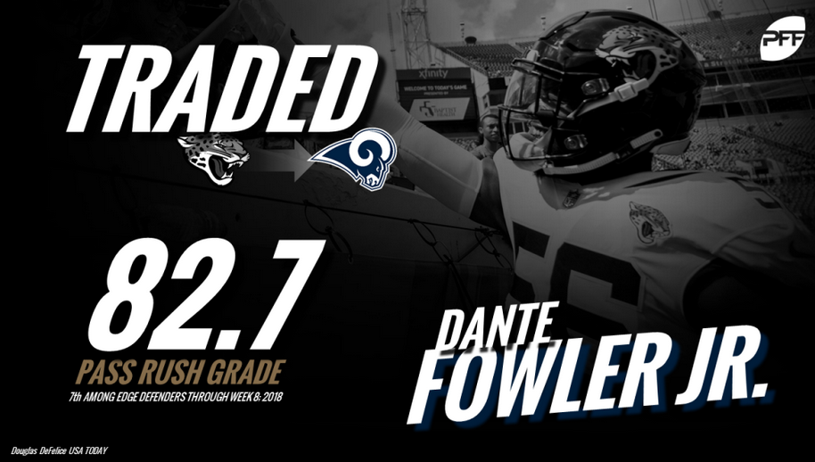 By Connor Price • Los Angeles Rams • Dante Fowler Jr. • Oct 30, 2018The Los Angeles Rams are effectively going all in on 2018 just days after they took down the Green Bay Packers. Los Angeles has traded their 2019 third-round pick as well as their 2020 fifth-round pick for former Jacksonville edge defender Dante Fowler, per Adam Schefter.